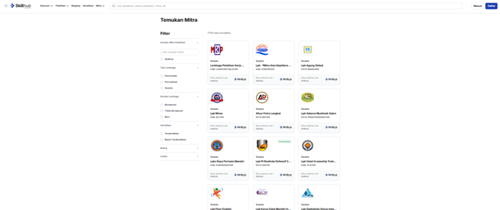 Pada Halaman Mula Layanan Kelembagaan, Anda dapat mencari lembaga yang telah terdaftar pada Kelembagaan Ketenagakerjaan melalui halaman muka, dengan cara memasukkan nama lembaga yang Anda inginkan pada kotak pencarian dan dapat menyaring hasil pencarian berdasarkan Jenis Lembaga, Provinsi lembaga tersebut: