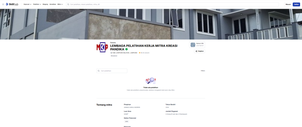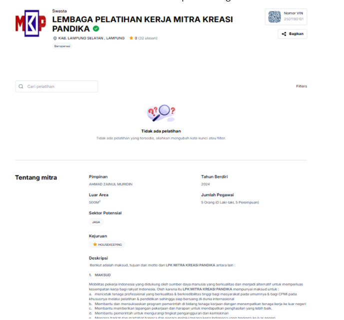 Pada halaman ini Anda akan melihat seluruh data lembaga, termasuk di dalamnya Profil Lembaga, Program pelatihan yang tersedia, Pelatihan yang diselenggarakan, Prasarana pelatihan dan Peralatan yang dimiliki oleh Lembaga. Anda dapat melihat detil informasi melalui tiap-tiap judul tautan menu yang dimiliki oleh lembaga tersebut.